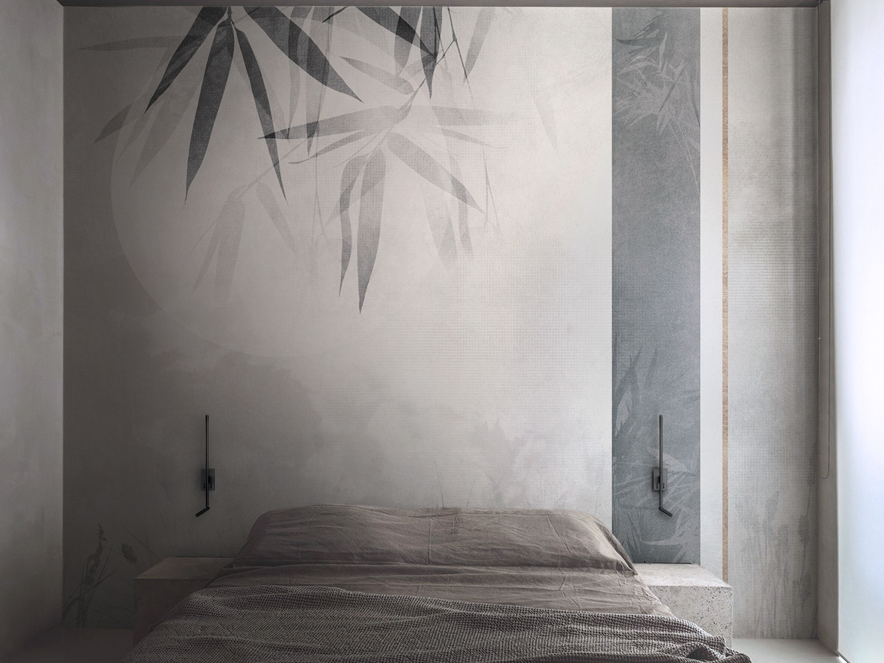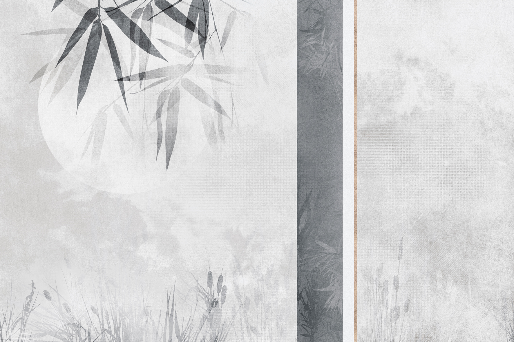 Dawn intimates the evocative moonlight slightly getting through a silhouette of bamboo leaves in the midst of a serene scene of wilderness.